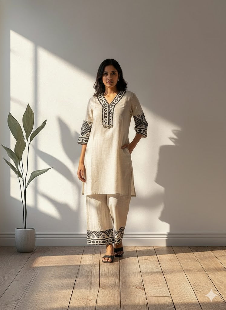 This Cotton kurti comes with matching pants. Made from Breathable Cotton material with an attractive embroidery which offers a casual look. Upgrade your wardrobe with this trendy ensemble.