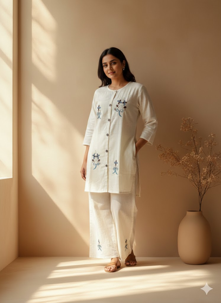 This Cotton kurti comes with matching pants. Made from Breathable Cotton material with thread work which offers a sophisticated look. Upgrade your wardrobe with this formal ensemble.