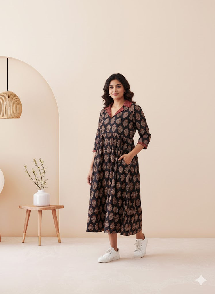 This Dress is crafted from comfortable cotton fabric, featuring an elegant traditional print that adds a touch of charm to your everyday style.