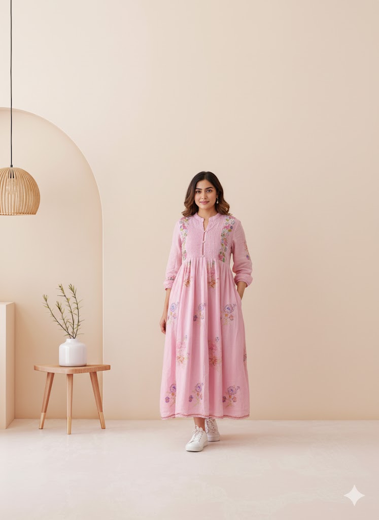This Dress is crafted from comfortable cotton fabric, featuring an elegant floral embroidery that adds a touch of charm to your everyday style.